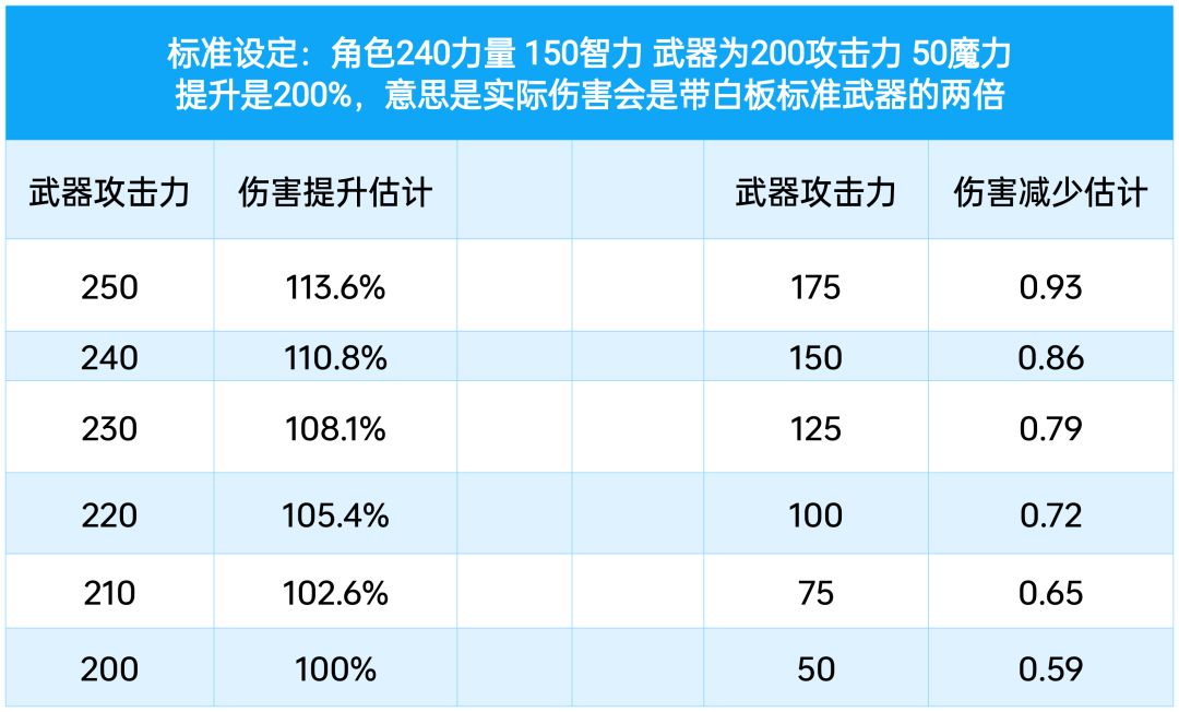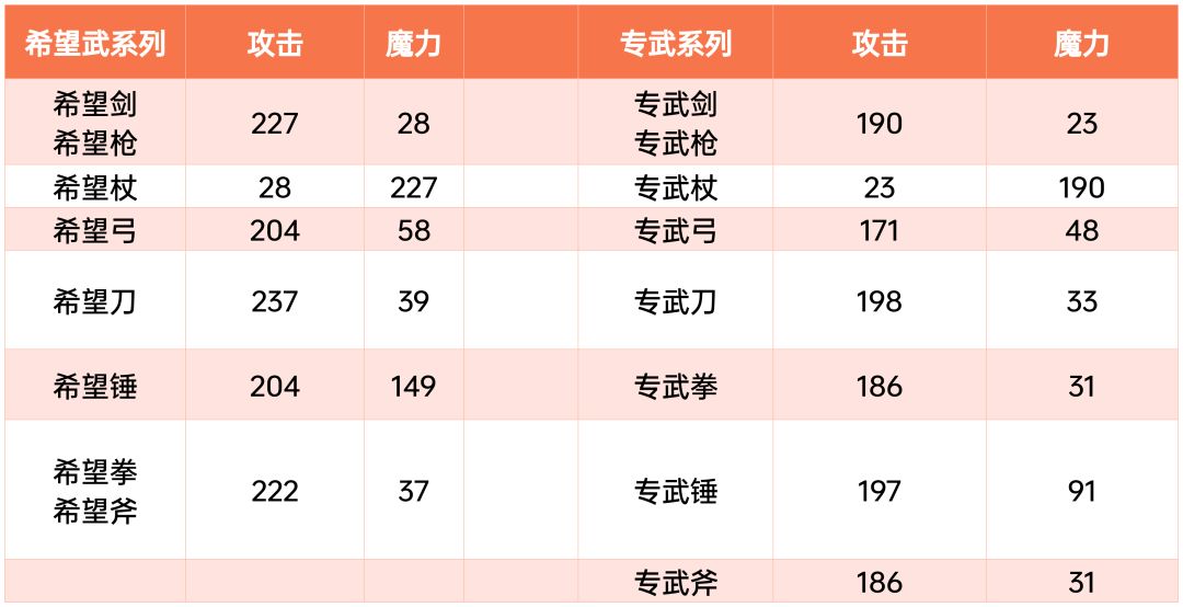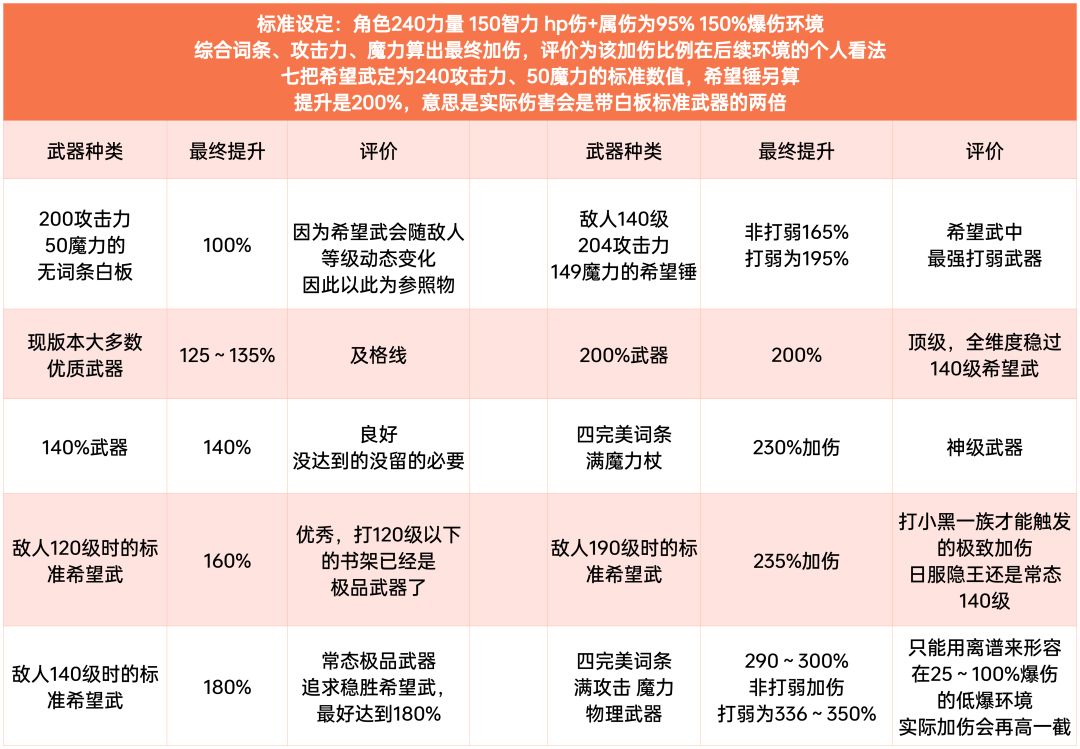 ③本帖把标准希望武的白值设为240攻击力、50魔力,超过这个就肯定比七把希望武强,希望锤后面会单独讨论