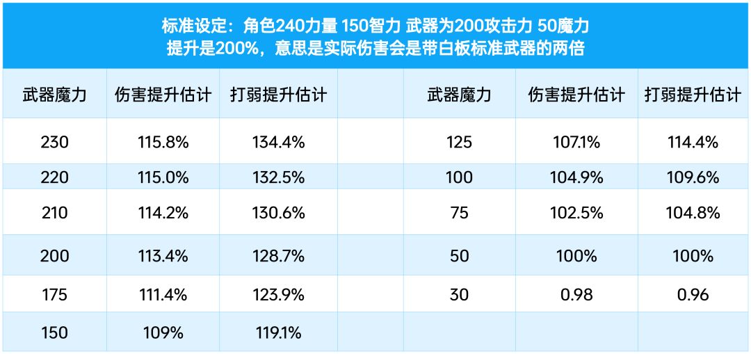 ②假如获得一把220攻击力、100魔力的武器,查表可知,正常加伤为1.054x1.049≈1.106,10.6%加伤;