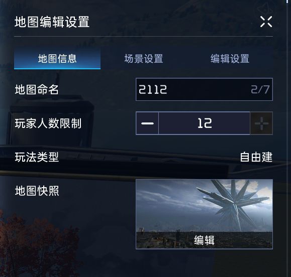 每次设计完后别忘了【保存】,养成好习惯!当设计进度达100%,可以先点击【设置】编辑地图信息,更改地图名、玩家人数限制等,再点击左上角【发布】~注意:所有的地图场景都需要设计者进行试玩后才可发布,请记得设计和谐友爱的建筑哦~