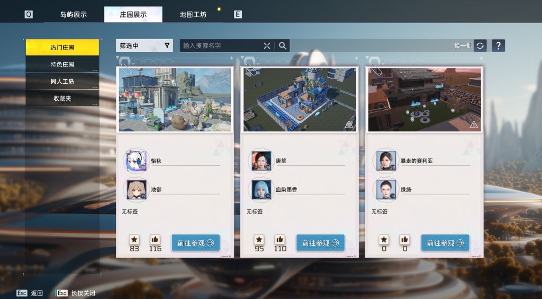 【共创工坊】分为岛屿展示、庄园展示、地图工坊三个区域。幸存者可将自己居住的人工岛、庄园上传至展示区,所有幸存者都可以参观拜访,并且进行点赞、收藏,给心仪的岛屿庄园增添人气值~