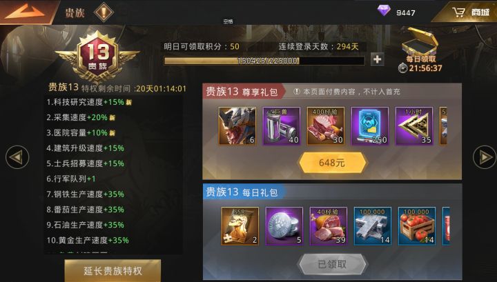 玩了294天,纯白嫖到了贵13,接近九百米战,经历了四国,八国,虎狼,这里的贵族可以拿钻石升,算是一个对微氪,白嫖的玩家一个友好点吧