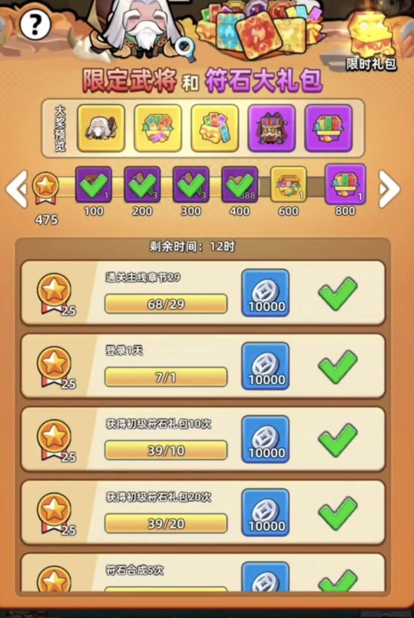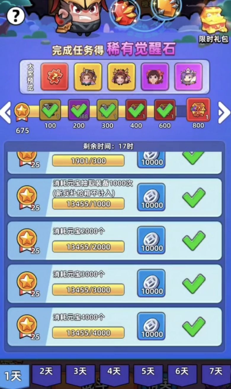 第八周,第十一周,比较良心的武器周,给很多装备的狗粮,白嫖连弩不可能,任务全做完元宝花到6w还要花66米才能获得最后的s武器自选,这周的靓仔和吕布一样,199抽,要氪米,出的攻城拔寨很费时间,收益也可观,从这时起,游戏任务时长已经到1.5小时~2.5小时了,出的武将交换前期可以养孙尚香养到6 7星,甄姬两星就行,碎片留着,交换后还可以再生一颗星,我现在就9星甄姬,2星香香,黄将只升级貂蝉,马超碎片少,出交换点亮就好,黄月英碎片也攒着交换后黄月英能3星,在换马超可以有8秒技能吃鸡用,武将结义可以一个紫一个黄,或者一个红一个黄,觉醒可以给一个黄将觉醒,一个紫将觉醒,都是共享的,这周正好第50天,剩下活动就是基本循环了,出的联动或者节日活动全开,该会玩的也就会玩了没啥在职教的了