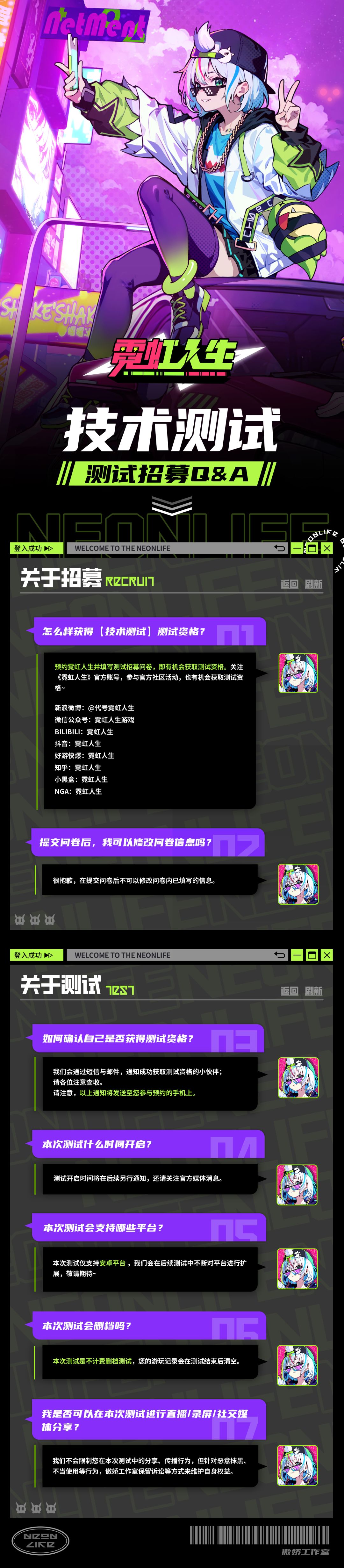 《霓虹人生》首次技术测试,现已正式开启资格招募。参与游戏预约并填写提交招募问卷,即有机会获取测试资格。