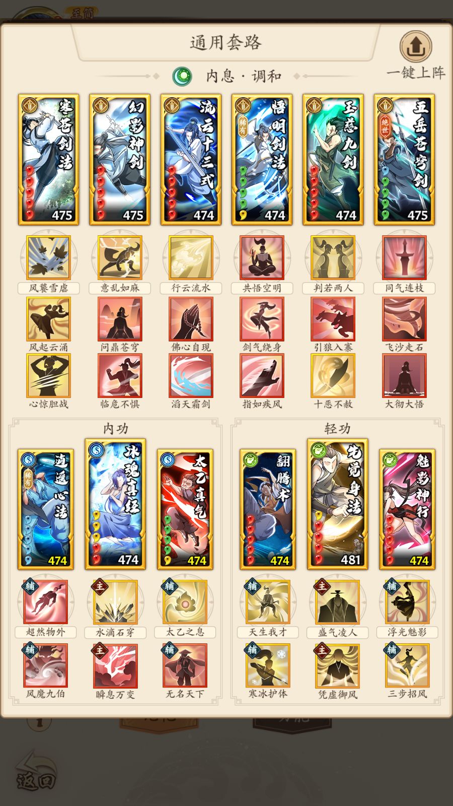 2,如果要改成DOT调和剑要怎么改呢?也很简单,首先改成主如鱼得水,除了有防吸内的作用外,还有冰魄心法带来的寒霜伤害增强的效果。问鼎苍穹换成生生不息,剑气绕身改成凤翔鸾集,飞沙走石替换十恶不赦,然后五岳带个出手夜行金烛。淬锋全攻击,但这个比较适合后期。攻击属性起来了之后,DOT伤害会很恐怖。