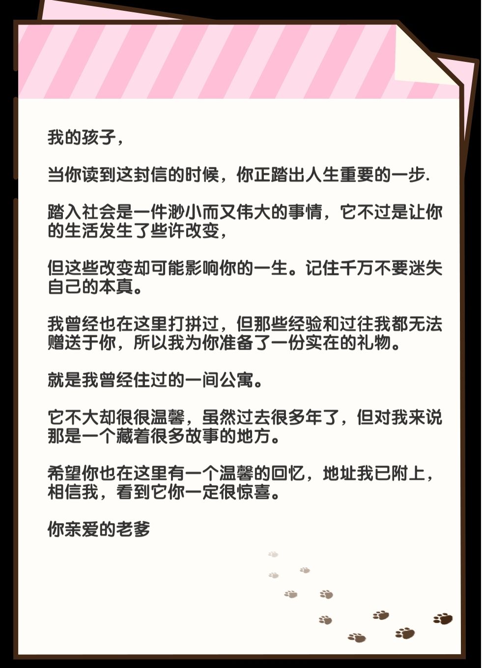 如果有一天你能听懂猫的话,他会跟你说什么呢,你想带他做什么呢,将心里所想与他分享?还是一起去探寻那个人的足迹?我猜你所想的那个人......是父亲吧?多少次的晚餐,热了一遍又一遍,那个人却还在外奔波;多少的夜晚你已进入梦乡,他还在为了你的未来负重前行;多少次你还在赖床,他已经蹑手蹑脚地出门开始了一天的打拼......你已经不记得多久没见过他了,只是每次见到都会惊觉他的鬓角又白了几分。当你慢慢长大总会离开家,那时的他又会做些什么呢,会担心你会孤独,会忧虑你的未来,会想将自己的经历与经验说与你听,可惜他嘴很笨,只能靠你自己去探寻~