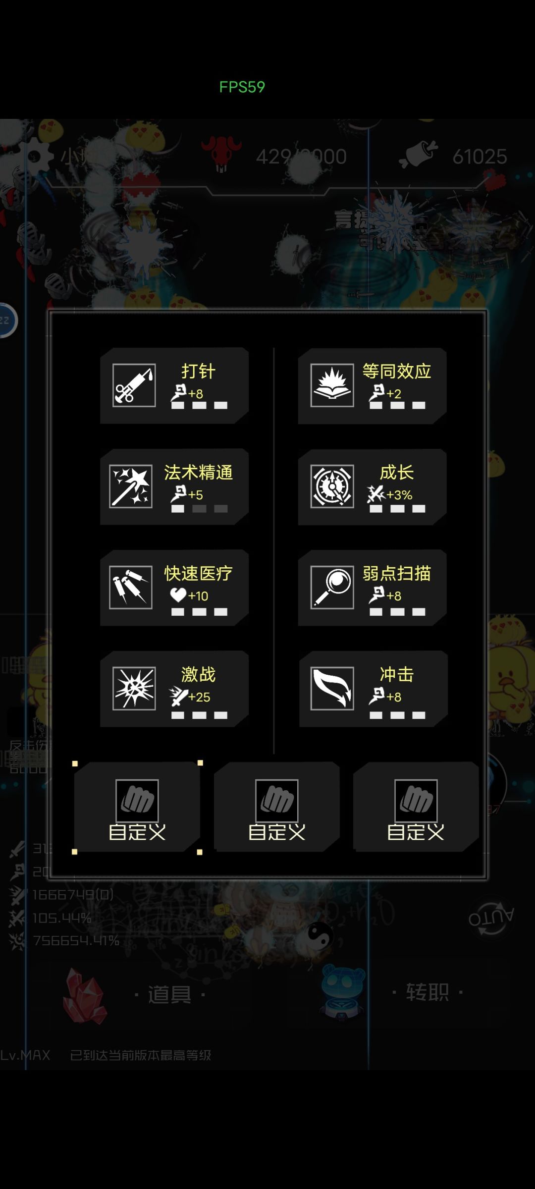 3.主要选着,召唤物+攻击,激战,开局,100关boss最好是召唤物+攻速,之后最好能随到多重攻击,第一能加小鸡强度,然后就能开始快速刷属性(200波之后boss第二选着普攻+技能,击杀目标后期基本没普攻多,击杀目标前中期还不错,攻速起来了,普攻一次,就十下左右)