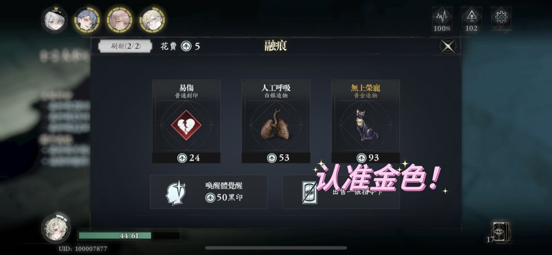 造物选择:推图中可选很多造物,眼花缭乱,不想动脑的学我,直接攒黑印选黄金造物,不够的话就战斗完再回来选