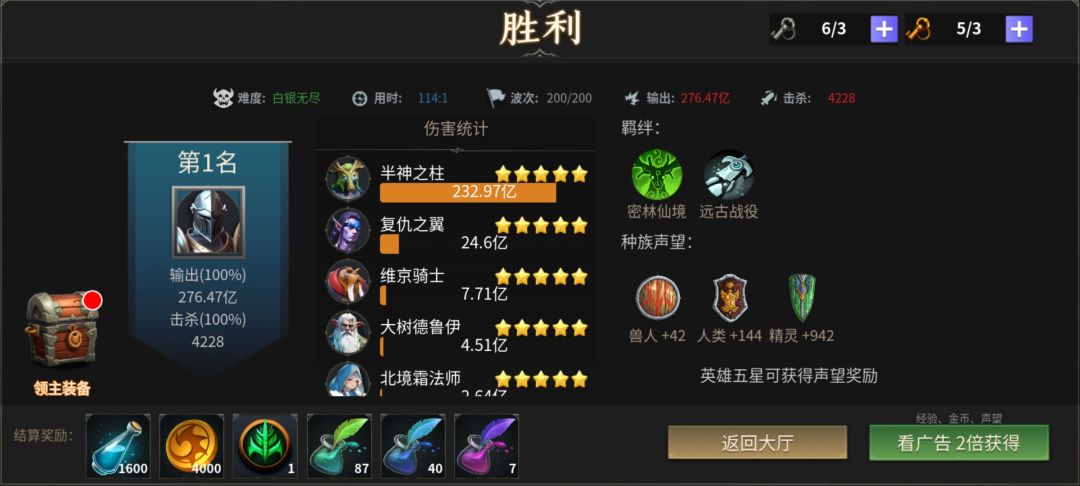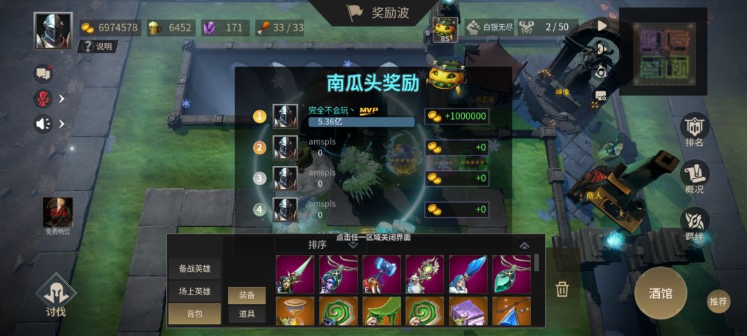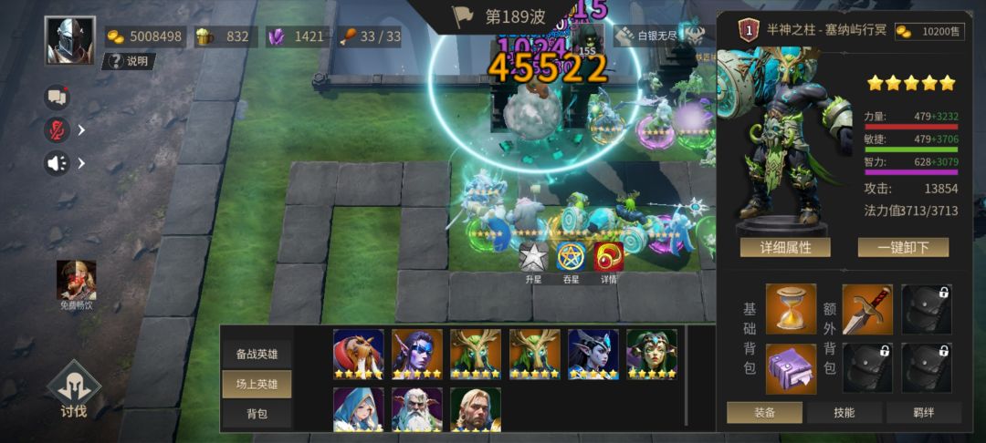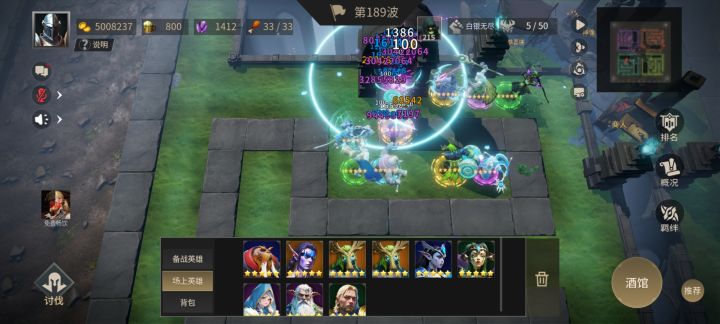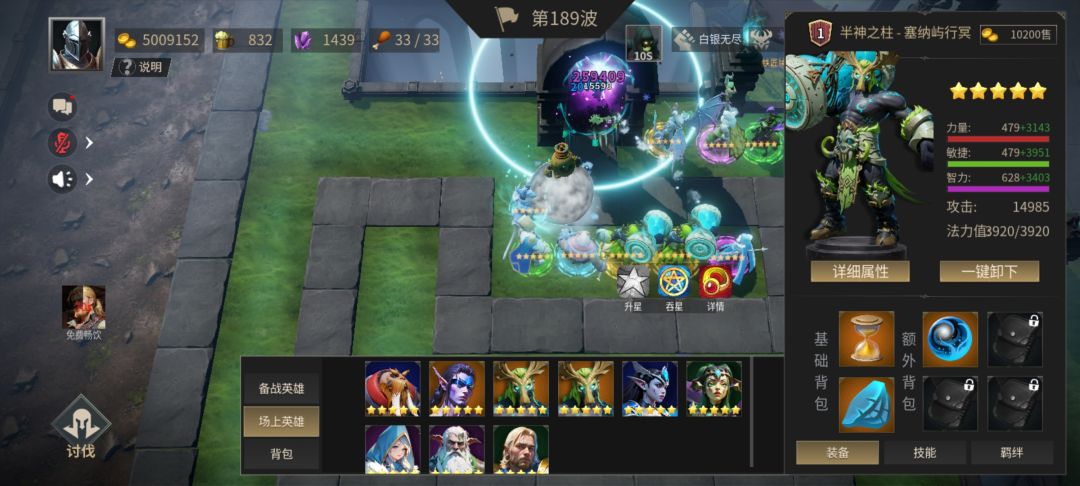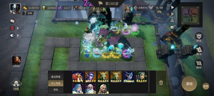 前期建议2叛逆骑士+2禁卫军长官+维京骑士轻松过渡,在第二个酒馆刷半神和其他英雄,越早上半神越好,属性会一直成长,后面顶人口,很容易就过了,如果不太顺就不要随便跳波了。50波后在地图中间过了天命试炼以后就刷,能刷到复仇天命最好,控制很足的,后面也可以补一个冰女加控制