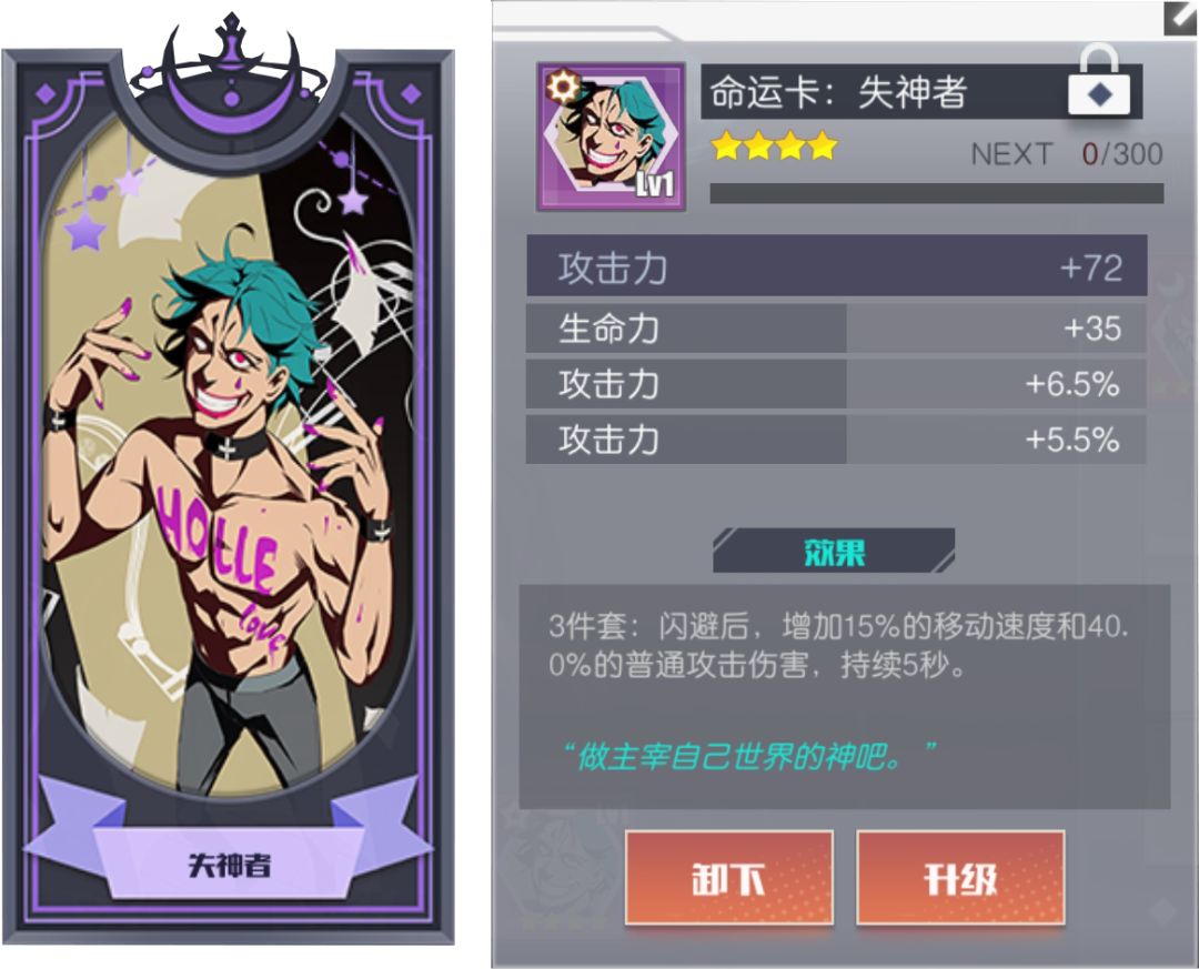 『失神狂热』套装命运卡:失神者;闪避后,增加一定的移动速度和普通攻击伤害,持续一段时间。