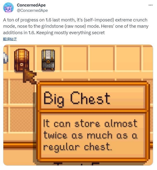》的作者ConcernedApe近日再次发文透露了游戏1.6版本的情报,他表示在上个月,1.6版本已经取得了巨大进步,但目前该版本还正在开发中。另外,在1.6版本中还将添加新物品“大箱子”,它能装近乎2倍普通箱子的物品。