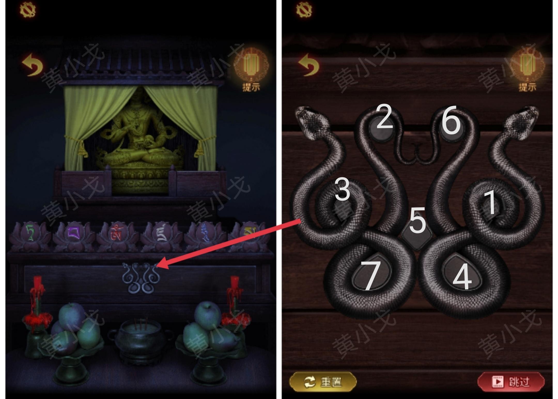 16.点击佛龛柜门上的蛇形锁,根据鸟鸣的声音特点及顺序,按顺序点击的蛇形锁上的按钮(每个按钮都有对应的声音)