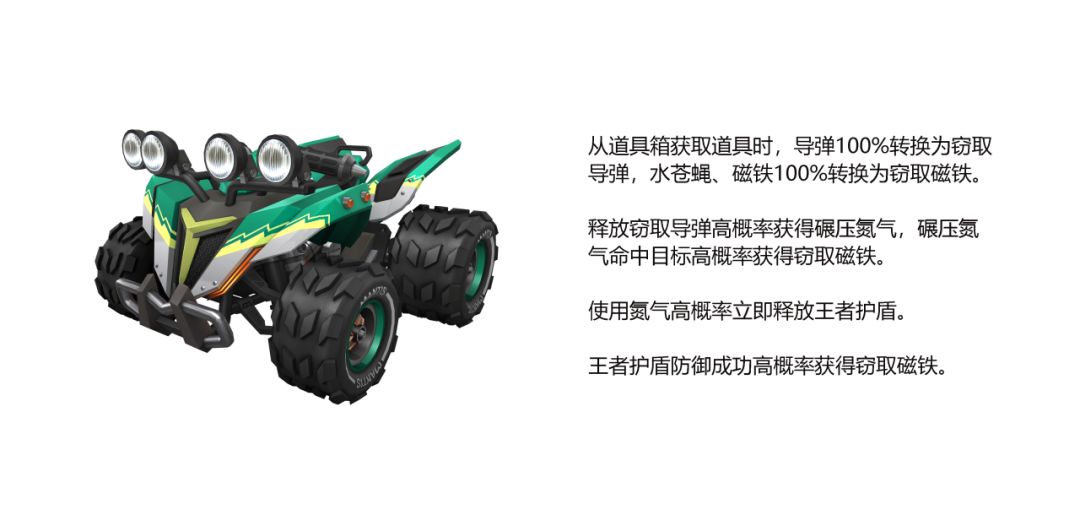 释放导弹后灵动螳螂还有大概率获得前进的动力-碾压氮气:一种可以将附近目标压扁的特殊氮气。帮助其快速上位,并顺便打击前方的目标,畅通无阻!命中目标后还有概率再次反馈窃取磁铁,嚣张的螳螂即将抵达赛场,前方的车友们可要注意啦~