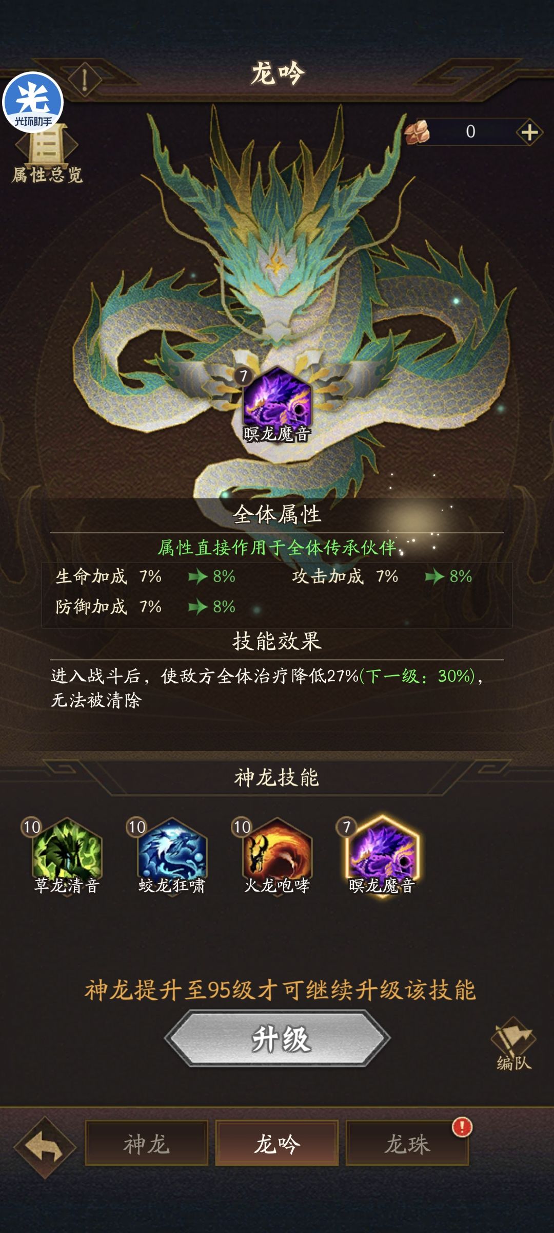 每1级,提升全体传承位角色1%百分比三围属性,最高提升10%,3种龙吟提升的百分比可以叠加,最高提升30%百分比