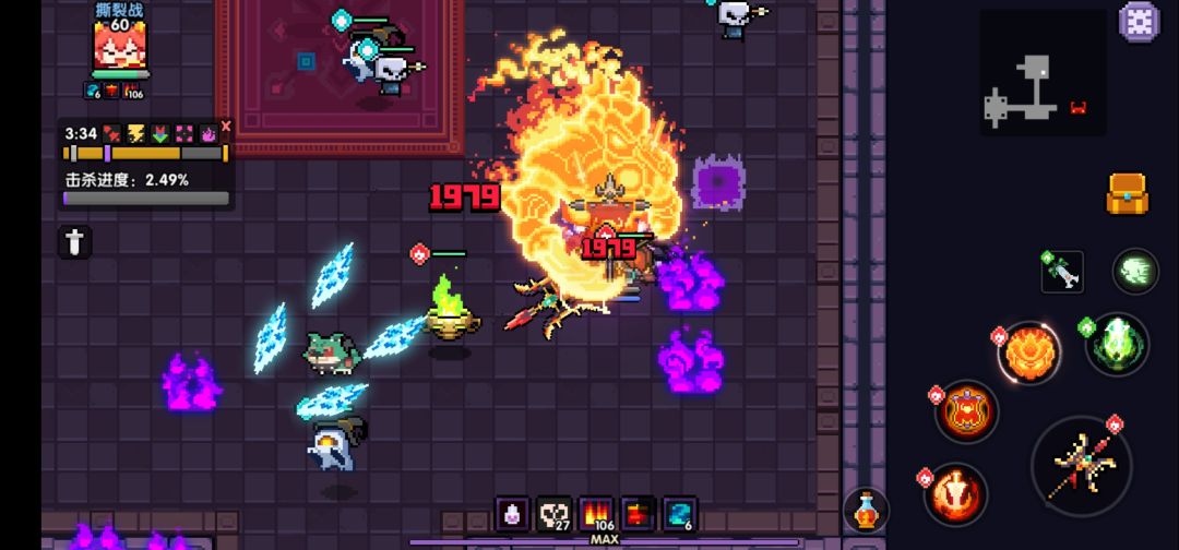 2 : 经过上述叠层后你已经基本拥有了十分可观的加伤与减少伤 接下来的小怪与精英图手法如下: 进图后 开启风车 把怪吸引到一起 然后普攻火神输出 在boss门前或者进度快满时 (需要注意的是根据你的进度与boss房间的距离来决定一个地方或者房间的平a次数 尽量控制在下图所示状态)