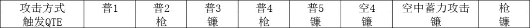 普1=第一段普通攻击,空4=第四段空中攻击,以此类推。枪=QTE枪攻击,镰=QTE镰攻击。