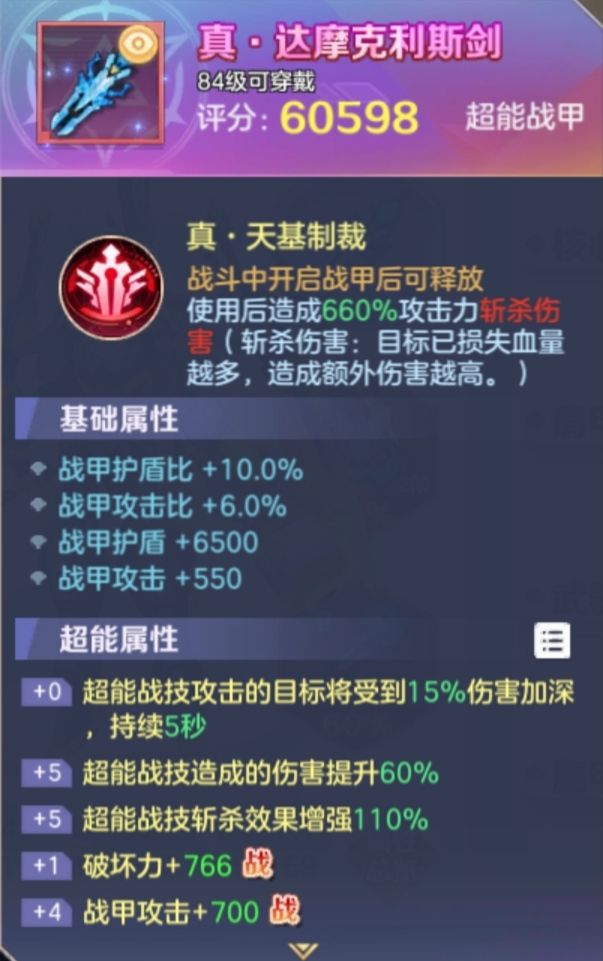 达摩克里斯之剑是第二代超能战甲,也是目前输出职业普遍利用最多的超能战甲之一,达摩克里斯之剑别的不说,高达战甲的外型帅气的无可挑剔,我个人觉得是目前所有战甲里面最养眼的一款。从功能上来说,达摩克利斯剑最大的作用就是残血斩杀效果,对手血量越少,伤害越高,在以往实战pvp玩法中,搭配精灵兽剑豪三天赋,基本三刀之后必定复活,竞技节奏十分快,基本上职业技能本身只能起到辅助的作用,精灵兽和超能战甲才是主导竞技胜负的核心。达摩有最大缺陷就是技能是指向性单一锁定,并且只有技能那一下有效果,随着现在新出的伙伴上场,达摩操作不熟练的锁定起来还真有点麻烦,加上现在战甲很容易被打破,达摩技能单一有效需要后手开,释放技能的时机也需要把握,所以使用起来需要点技巧。