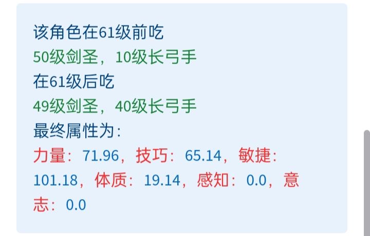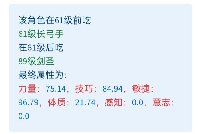 最终为96敏捷,庇护6点,小技能13,转职12,最后裸敏捷为96+6+13+12=127