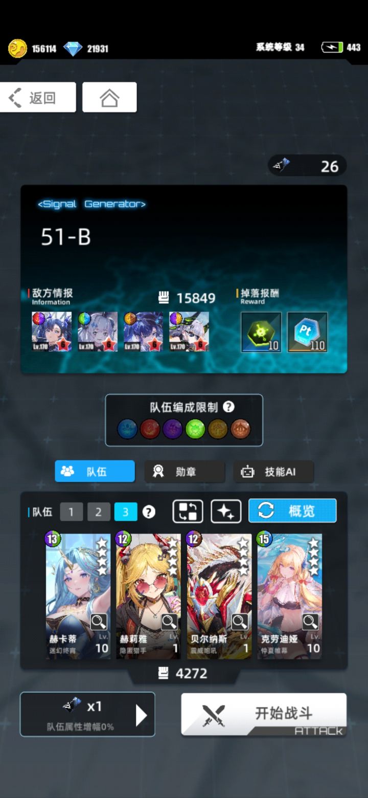 思路来自之前有个人发过的赫卡蒂刮刮队,23号位我调试了一下,意外发现2号位这个卡挺好用,还能吃到克劳迪亚buff,虽然断连概率不小,但是冰冻加混乱对于自动前50够了。其他卡试过星见,晶花指挥官等等,充能效率都和这个2号差不多。贝尔纳斯在这个队里很适配,火转水,能消化别人剩下的火宝石,效率很高。