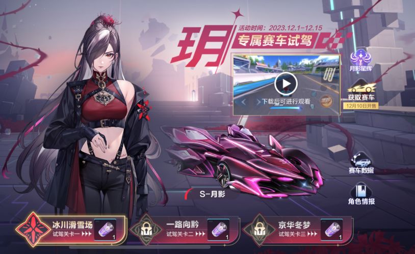 S-月影试驾活动已经开启!车手们可以在冰川滑雪场、一路向黔、京华冬梦三条赛道中试驾S-月影,体验最新赛车手感的同时,还能带走月影专属能源奖励!