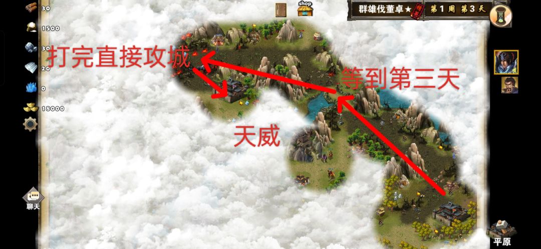 打法思路:开局我们先把卡片装备上,然后去拦路怪那里等到第三天(避免和其他敌方武将战斗)解决这个拦路怪,接着直接去打地狱犬。战斗开始以后曹操开大鞭策赵云,赵云对着地狱犬释放二技能接一技能,次回合曹操传送自己远离地狱犬让赵云收割。(这里曹操可以换上月光马,或者换上五色石强杀)解决完地狱犬以后不要停留直接去攻城(又可以避免一次敌方武将战斗)。