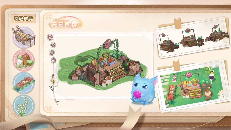云朵果铺琳琅满目,铺子上放置有云朵城特有的云朵果、云芒等水果。正上方悬空以“云朵果”的图片作特色招牌,根据区域划分摆放水果,给人一种麻雀虽小五脏俱全的感觉。
