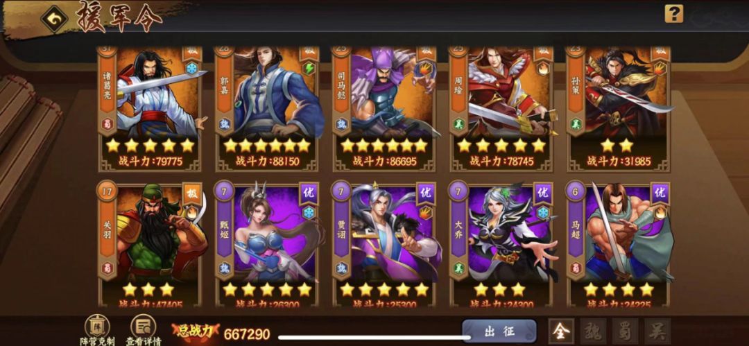 在平民玩家倾其所有激活四大极品援军并成功搭配3星司马和诸葛亮之时,不论是后续吴系援军也好,再出新援军也罢,就算是新援军属性很高,大招性能很好,或许也能激起你的欲望,但我们要平心静气去面对。不可能对我们之前的付出和培养置若罔闻,再想集中元宝和养成材料去弄难度可想而知!因此平常心对待各种手游进程的变化至关重要!平静看待武将和援军的迭代,保有对游戏的热情和向上的激情。我们也见过那种走极端的玩家,一门心思只培养一个援军,要跟主将一样强悍,这就很容易导致顾此失彼的情况发生,反而适得其反。
