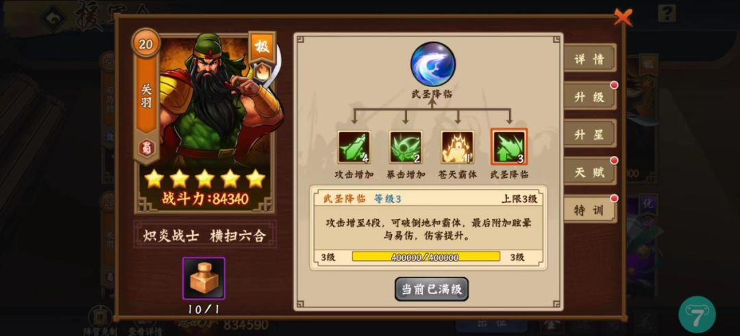而极品援军的特训内容,那些属性攻击,我个人不建议升级,有多余的将军印可以升到五~十级。像司马特训一二技能百分比攻击、暴击、郭嘉特训一三技能加强主将输出频次的,都可以多升级一些。目前阶段援军大招我建议平民玩家升到二级就行了,还不到火候非要升到三级。