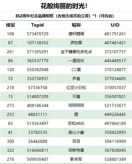 请获得ES2周年纪念萌趣相框(含组合成员拍立得)的制作人在自选&地址收集时间(即日起至2023年12月20日23:59:59)内,凭个人TapTap主页截图以及游戏档案截图,通过游戏内客服或企点QQ助理君【800039416】登记选择的队伍,逾期未填写地址将视为放弃实物周边。实物奖品预计发货时间2024年3月。
