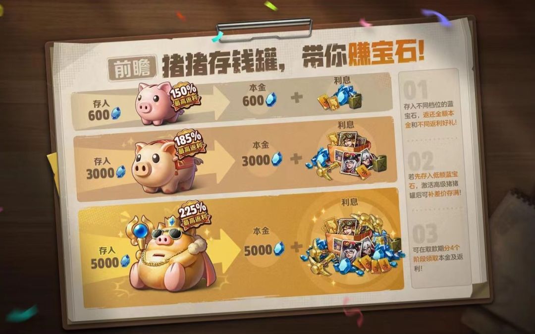 它们不仅代表了三种不同的品质,存入蓝宝石的上限也有所不同。可存入的蓝宝石数量将随着存钱罐的品质上线逐渐提高,高品质的存钱罐,可以存入更高档位的蓝宝石~存入的蓝宝石越多,获得返利也就越多哟!小留美提醒指挥官们,可以点击猪猪存钱罐图标或升级按钮查看存钱罐升级条件哦~