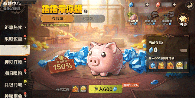 指挥官们可点击“存款期”和“取款期”切换存取款界面,可在活动界面显示的时间区间内进行存款,时间截止后将无法进行升级存钱罐和存款操作。存入蓝宝石后可以立即获得一份奖励,如果当前存入数量已达容量上限,指挥官们可以选择升级存钱罐品质,激活高品质存钱罐后,可以通过补差价的方式将存钱罐填满,获得更高的利息和奖励。