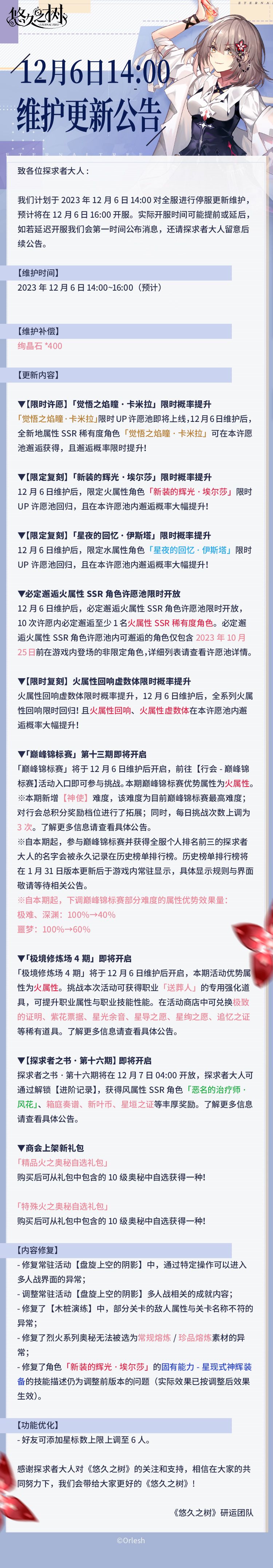 我们计划于2023年12月6日14:00对全服进行停服更新维护,预计将在12月6日16:00开服。实际开服时间可能提前或延后,如若延迟开服我们会第一时间公布消息,还请探求者大人留意后续公告。