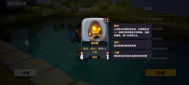 力量阵容大核心为熔核蟹。通过融合使其他石灵获得力量成长,成长亦可配合羊玲奶奶。