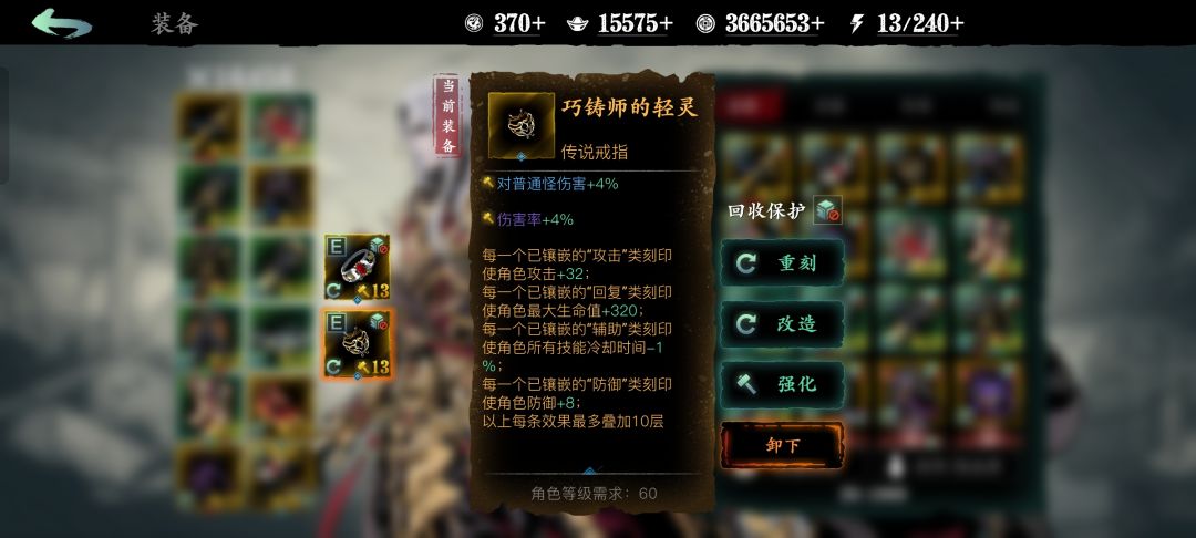 巧戒基础叠满10层 顺带狂肩的层数叠到6层(武器 手套 鞋子 项链 戒指两个 攻击力一共是680)