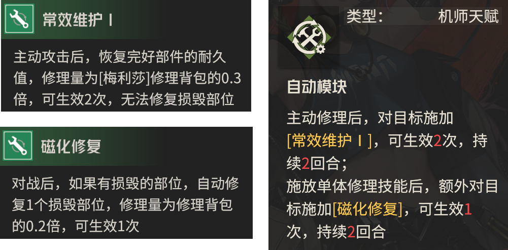 然后梅利莎的天赋很简单,玩过紫龙其它战棋游戏的朋友也不会陌生,说白了就是治疗后会给目标施加一个可生效2次的自动奶效果(需要主动攻击后方能触发),梦战的奶骑、天地劫的舞蝶表示这点我熟啊!另外梅利莎的天赋在进阶后还可以额外施加一个【磁化修复】的效果,可生效1次,大家注意这个【磁化修复】是可以修复一个损坏部位的,这点对于奶妈来讲就算一个非常重要的治疗质变了,而且这个效果是战后触发的,所以如果对战中某个部位被干掉了,是可以立刻修复部分血量的,这也是梅利莎非常重要的一个特色。