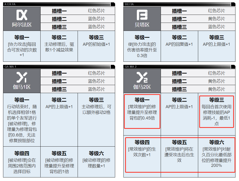 - 【战地校准】:辅助增伤类技能一个,命中率提升4%,伤害提升10%,中规中矩的提升量,不过在某些需要机制伤害的关卡中,这个技能就能排上用场了