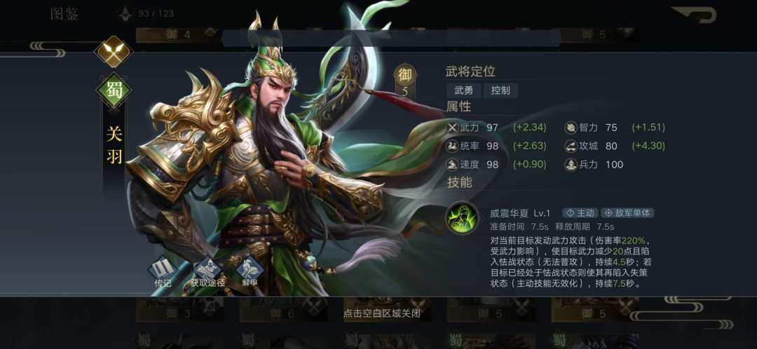 关羽作为前排,可以使对手陷入怯战和失策状态,输出能力也有足够的保证