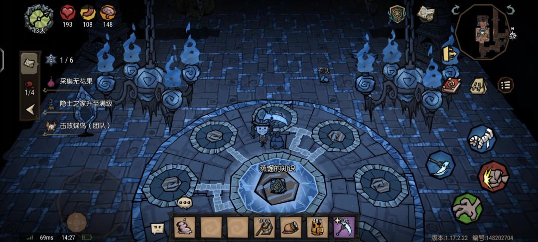 拿到知识之后可以参考下方视频解锁配方(每个人顺序都不一样),一共可以解锁三个,其中有一个配方是星香探测仪,探测仪可以在陆地上寻找到两个天体祭坛零件,需要搬运到船上运到月岛上(手游内测没有完善星象探测器功能这里不做演示)。
