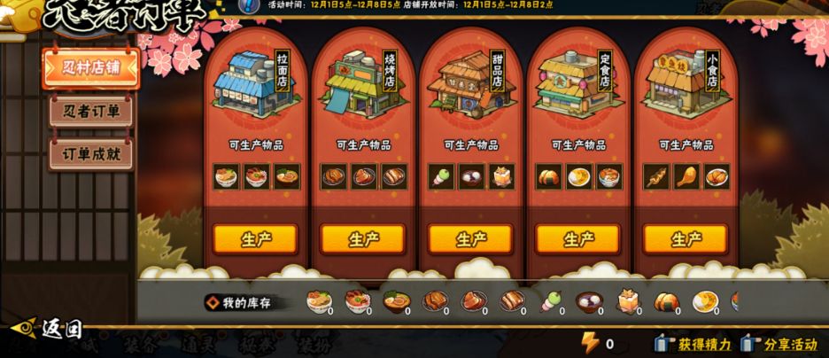 玩家消耗精力和时间,在店铺里制作食物,然后交给需要的忍者,就能获得丰厚的奖励,订单成就越多,就还能额外获得成就奖励。大蛇丸的奖励中更是有随机忍具宝箱。
