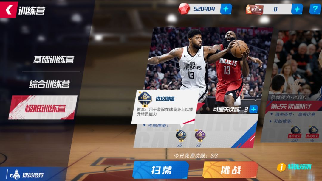 每日训练营里每关都有三次免费挑战机会,都有几率掉落徽章,首次通关必得徽章!通关到第五关,经理人至少可获得3个三星徽章!