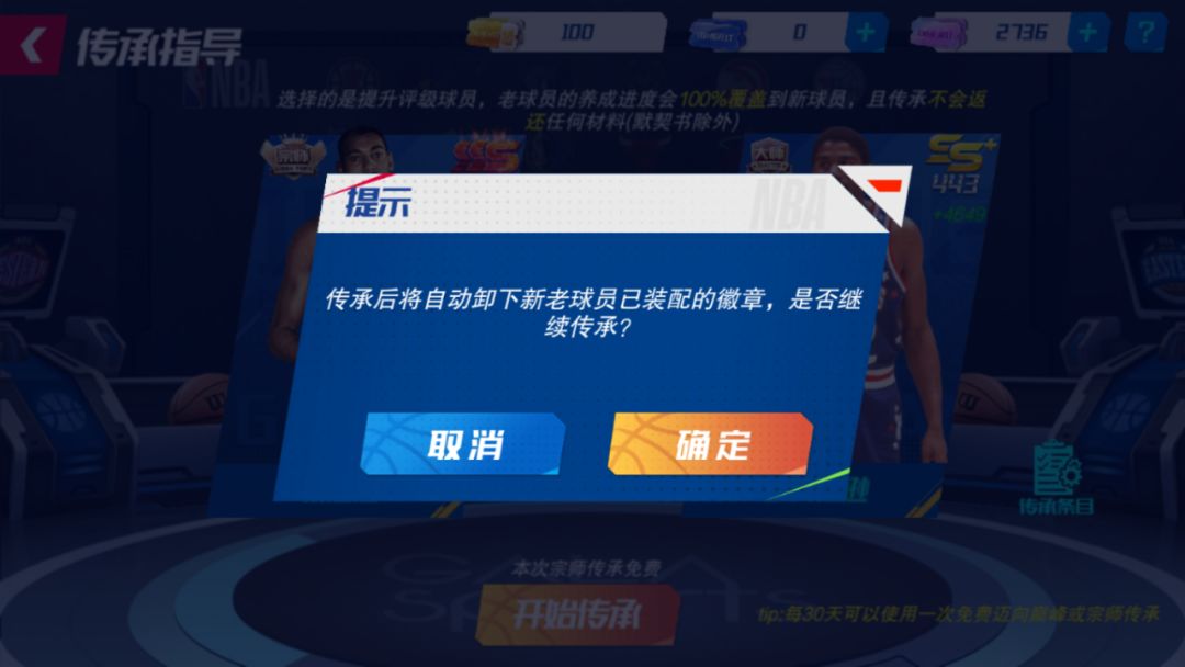 已装配徽章的球员作为被传承球员进行传承时,将弹出提示“传承后将自动卸下新老球员已装配的徽章,是否继续传承?”,点击【确定】后将会把球员徽章全部卸下,不会损失掉经理人的徽章!