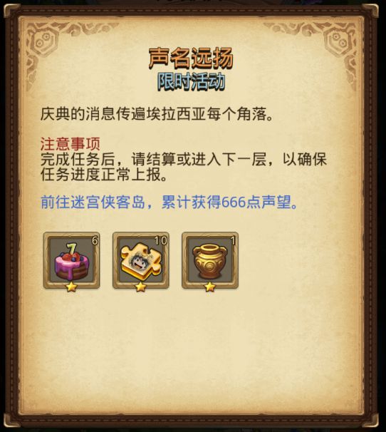 前往迷宫侠客岛累计获得666点声望