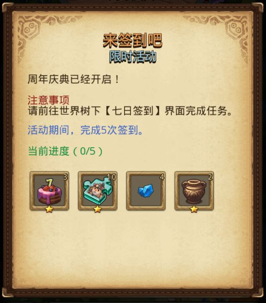 活动期间,累计完成5次签到即可获得钻石、碎片等奖励