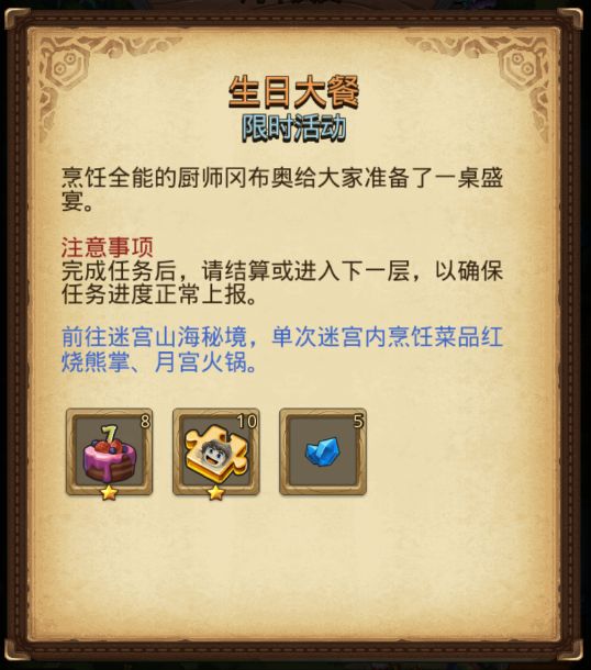 前往迷宫山海秘境单次迷宫内烹饪菜品红烧熊掌、月宫火锅