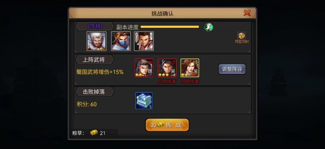 前期我们所做的战力增益铺垫,其目的就是可以更好的攻克守将。在前15层的守将中移除了真霸体的效果,所以这时候考验我们过关能力的主要是战力的提升以及武将的连击能力,二者缺一不可。随着关卡的递进,守将的血量和伤害也会有所提升。这就意味着我们一不能给守将还手的机会,二要打出足够的伤害,这样才能尽可能的一次通关,从而不会浪费粮草。当然也要量力而行,需要很多次才能击溃守将的话不如直接扫荡上一层。