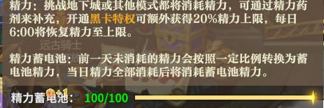 游戏中的黑卡功能也是精力的获取来源之一。开启黑卡后,每日精力能从80点提升至96点,每天能额外获得16点精力上限。同时黑卡为账号共享,这也意味着账号内一个角色开启黑卡,该账号所在区服的所有角色都能享受黑卡收益~