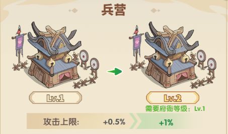 提升建筑的等级可以产出更多的资源和提升更多的属性,但是建筑数量和等级会受府衙等级限制。