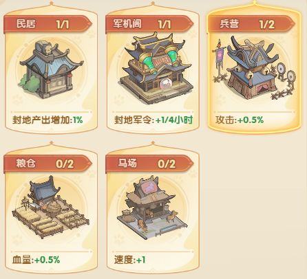 玩家在封地中可以通过建造建筑来获得额外资源,以及提高武将的战斗属性。