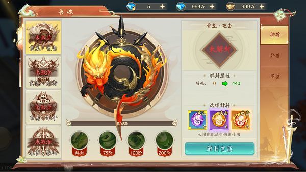 有神兽自然少不了异兽了,在当前版本,暂有北鲲、南鹏、穷奇三大异兽分别对应天赐、净化、无视三种效果,激活异兽解除封印,为你的异兽提升实力的同时,自身也能获得附加属性效果,你也可以选择兽魂注灵,追求更极致的加成效果~