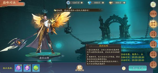 巅峰对决玩法,也是一种PVP爽战玩法。活动时间为每周二、周五。玩家在20:25-20:30期间有五分钟的准备时间,在20:30-20:45期间的15分钟来参与活动。