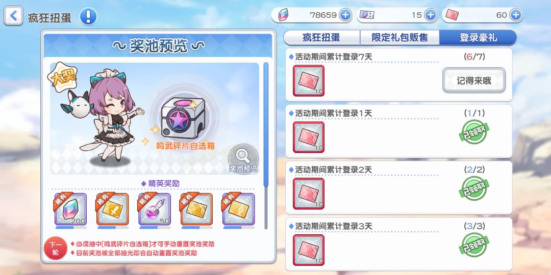 纯抽奖活动。月卡党的话只要点入“登录豪礼”拿送的票,然后囤起来,后期要囤大量的活动票再抽奖才能冲击后面的大奖。(虽然我至今120多天还在囤)。